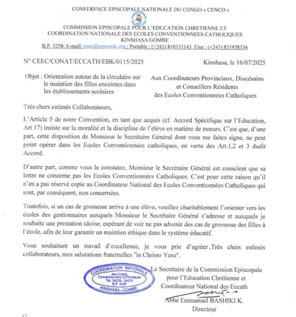 Dans une correspondance officielle adressée aux structures de son réseau scolaire, l’Abbé BASHIKI exprime sa désapprobation face à cette directive gouvernementale. Il déplore que la circulaire n’ait pas été notifiée aux écoles catholiques conventionnées, ni soumise à leur consultation préalable. Pour cette raison, insiste-t-il, « aucune élève enceinte ne sera admise à poursuivre ses études dans les écoles conventionnées catholiques », soulignant ainsi l’indépendance pédagogique et éthique de ces institutions.
