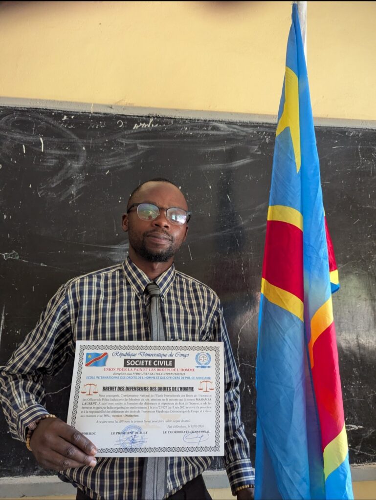Une nouvelle voix s’ajoute parmi les défenseurs des droits humains en République démocratique du Congo. L’activiste congolais Laurent Mahamba vient d’être officiellement enregistré comme défenseur des droits de l’homme auprès de la Commission Nationale des Droits de l’Homme (CNDH), à l’issue d’une formation certifiante suivie à l’École internationale des droits de l’homme et des officiers de police judiciaire.